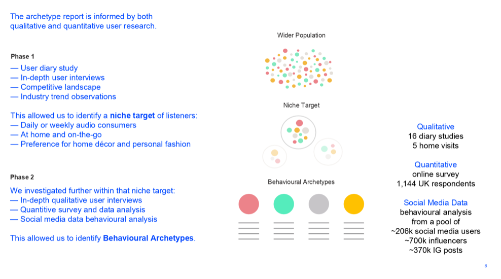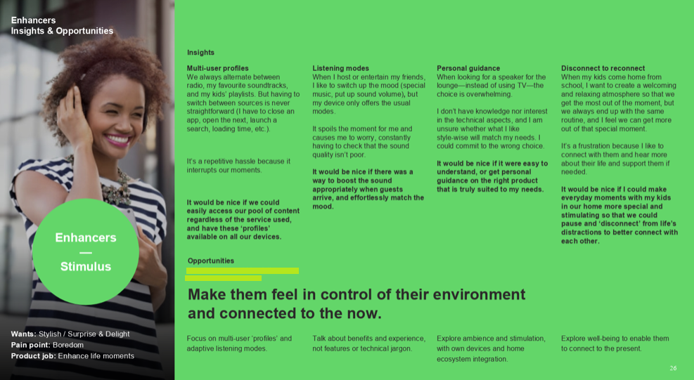 β΅Knowing where you are going is the first step to getting there. Interviewing the Executive stakeholders, it didn't take long to uncover the first challenge derailing success; there was no vision for the future, and no calibration with the market or customer needs. Without a clear direction, the company was, at best, treading water. By establishing a clear compass direction, we could create clarity throughout the business, and synchronise efforts to a common goal. β If you prioritise everything, you pioritise nothing. The lack of direction lead to a lack of focus throughout the company; when you're not sure what your strength is, or what your market needs, you naturally try to be everything to everyone. The result; neither brand nor product provided customers with anything to latch on to; research revealed customers couldn't distinguish this company from any other. And without a clear vision to guide product strategy, products were mainly built by reacting at a feature-level to competitor offerings. The result was a huge, expensive product portfolio, with a long tail of many loss-making SKU's, and primarily undifferentiated products suffering from feature-dump, out of touch with customers' real needs and current audio behaviours. However, that was also an easy first step to release immediate cash flow to fuel near-term innovation. Focus is scary; but with solid customer insights and a clear business strategy, I could gain the confidence of the board to implement a 65% rationalisation in the portfolio, maintaining a disciplined focus on just a few products designed specifically for the needs of the two most relavant, lucrative customer archetypes. π―β¨Product-market zeitgeist makes competition irrelevant; when you can confidently intersect your own strengths with the future of the market, that's a recipe to win. While cost-efficiencies and iterative product improvements gave us some immediate wins, to give this company the best shot at long-term survival, we'd also need to anticipate the future, conducting a future foresight study in the Music & Audio space within the wider project. This company still had significant strength to draw on, including a strong local history, and iconic product design. Copying competitors meant losing touch with that identity but customer research showed there was still value there. By triangulating the future market direction and company strengths with an extensive market needs and sizing study, we could identify exactly which archetypes and needs to focus on. This gave the company a long-term blueprint for innovation. |