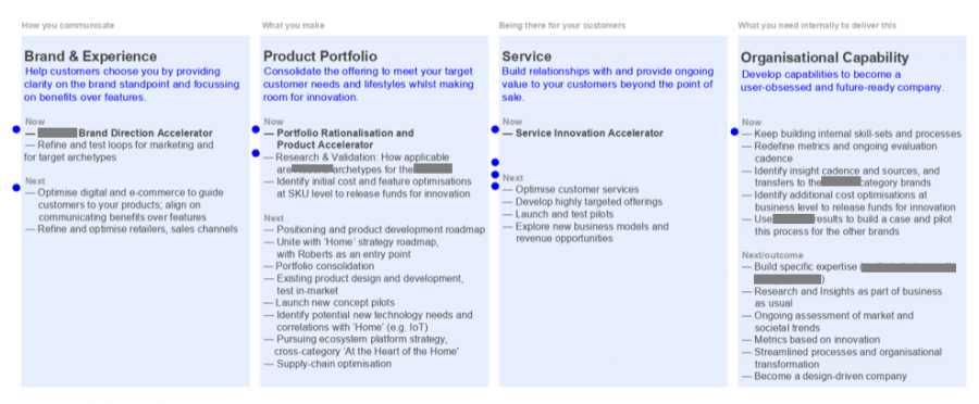 π Buy-in and $ investment from a confident Board and Executive team: these stakeholders were tightly involved at every stage, even accompanying my team on field research in the home of customers. This was a critical step in establishing a culture of evidence-driven decision-making. The PE owners were confident a step-change had been made and agreed to fund the innovation pipeline to increase momentum π Immediate 137% increase in profitability. Combining cost-efficiencies with targeted growth opportunities delivered immediate results, which would only improve over time as market traction increased. Initial tests from the pilot project, including product design and marketing, also showed much stronger product purchase propensity and brand loyalty than the company had ever seen. By focusing on just a few products, specifically designed for the identified archetypes, our testing showed a much higher degree of interest and loyalty, with customers really resonating with products they felt were made 'for them'. β‘ Building at pace, while maintaining alignment. With a clear vision, an evidence-driven strategic framework and culture in place, and a strong insight feedback-loop fueling product and marketing strategy, my team established a solid foundation for decisions across the company to happen faster, with greater cohesion and success; while leadership was increasingly confident in decentralising decisions away from management, reducing wasted resource and freeing up Executive time to focus on forward-looking planning. π± Scaling success with a new blueprint for innovation and decision making. Alongside product innovation, my team designed a new workflow to scale change within the business and embed insight and innovation as a core capability. This worked so well, th ePE owners scaled this workflow through other companies in their portfolio. |